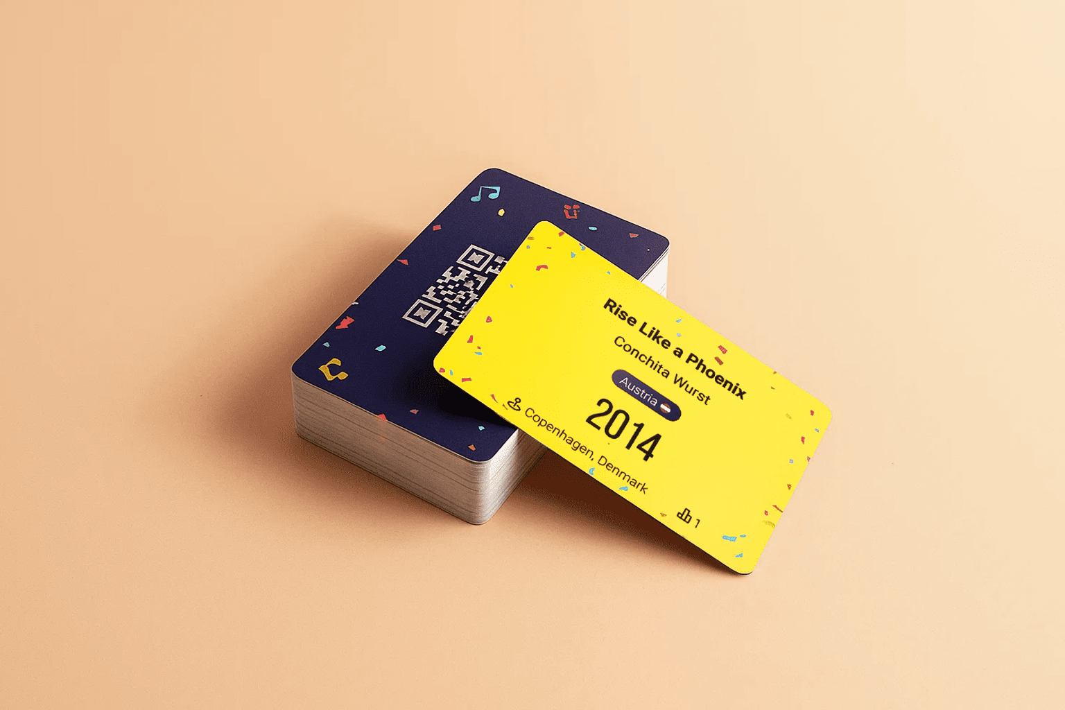 Tauche ein in die Welt der Musik, Erinnerungen und des Spaßes mit QR Music Cards. Dieses Musikquiz macht jeden Anlass zu einem musikalischen Erlebnis. Wähle aus 17 Editionen mit über 2.000 Hits – von Klassikern bis zu aktuellen Hits. In dieser Eurovision Song Contest Edition spielst du Songs aus den Jahren 1956–2024 von Künstlern wie Udo Jürgens, Céline Dion, Conchita Wurst, Nemo und Måneskin.